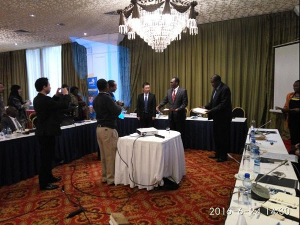 董國(guó)鋒處長(zhǎng)及肯尼亞商務(wù)部首席秘書(shū)Dr Chris Kiptoo共同頒發(fā)此次培訓(xùn)的結(jié)業(yè)證書(shū)