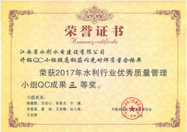 公司連續3年獲水利行業優秀QC小組成果獎