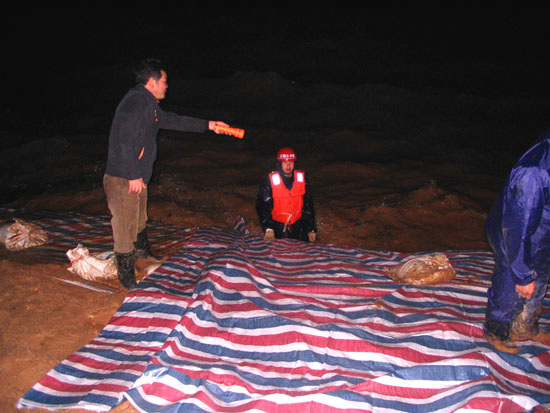 曾俊平等在江水中鋪設(shè)防浪彩條布和砼預(yù)制塊