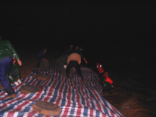 根據(jù)以往的施工經(jīng)驗,我們很快啟動了搶險應(yīng)急預(yù)案。但由于環(huán)境惡劣,考驗我們的時候到了,要發(fā)揚我們江西水建人“特別能吃苦、特別能戰(zhàn)斗、特別能忍耐、特別能協(xié)作精神”的時候到了,我們與洪水搶時間、爭進度,全體干群在漆黑的大堤上是一片穿梭奔跑的身影,大家齊心協(xié)力,手提肩扛,把一百多斤一塊的混凝土預(yù)制塊,一塊塊運到堤腳,此時項目部總工曾俊平不顧江水的寒冷,帶領(lǐng)其它幾名員工,奮身躍入水中,在水下鋪設(shè)彩條布,而此時水下溫度只有10℃左右,渾濁江水一浪高過一浪拍打在他們的身上。大家顧不上寒冷,顧不上疲勞,顧不上饑餓,衣服濕了又干,干了又濕,分不清是哪次被汗水還是雨水弄濕的,在微弱的手電光照亮下鋪設(shè)了一條又一條彩布條,碼起了一道又一道沙包小堤。經(jīng)過大家的緊張奮戰(zhàn),終于幾處險情得到了控制,等到我們在忙碌中回過神來時,已經(jīng)是次日的凌晨三點多鐘,盡管大家拖著一副疲憊不堪的泥身子,但大家臉上裝滿了滿意和勝利的微笑,王總此時飽含真情地對大家說了一聲:“大家真的辛苦了,謝謝大家!”走在回家的路上,我正好與項目總工曾俊平走在一起,我看到他渾身濕漉漉的,我關(guān)心的問他在水中冷嗎?他笑笑說道:“這是關(guān)鍵時刻,再冷也要下”。他旁邊的同事告訴我,他是從下午三點鐘就一直在水里做事直到剛才,整整在水中浸泡了十二個小時。我們參加搶險的同志被曾俊平這種不怕困難、不畏艱險、不顧個人安危、敢于吃苦的精神深深感動著,真是我們學(xué)習(xí)的好榜樣!