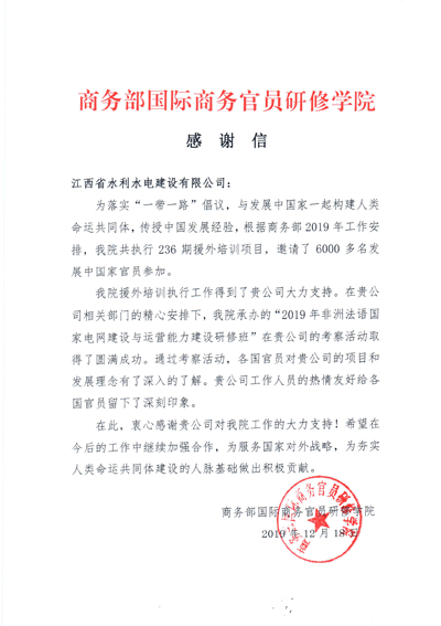 2019年,公司圍繞國家和我省“走出去”戰略,積極配合商務部及省內援外培訓工作,得到各方認可。近日,公司收到來自商務部國際商務官員研修學院的感謝信,信中提到,商務部研修學院援外培訓工作得到我公司的大力支持,“2019年非洲法語國家電網建設與運營能力建設研修班”考察、交流活動取得圓滿成功,對公司的積極配合表示衷心感謝。