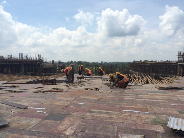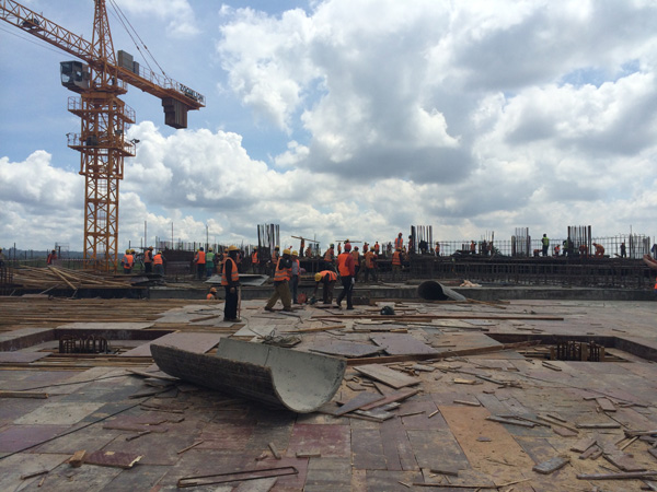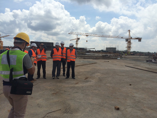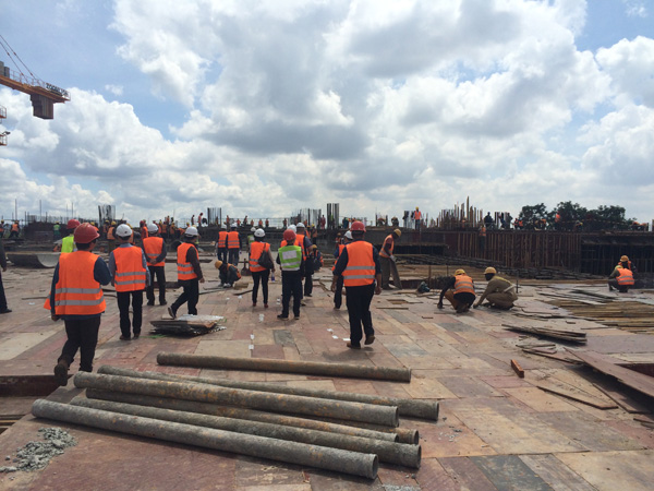 “雙河”項(xiàng)目是一個(gè)集零售商場(chǎng)、現(xiàn)代辦公樓、公共娛樂以及配套設(shè)施的綜合性工程,作為東非最大的在建城市綜合體,總建筑面積為18.2萬(wàn)平方米,單層面積就超過四萬(wàn)多平米。雖然出國(guó)前我對(duì)“雙河”項(xiàng)目就有一定的了解,但親臨現(xiàn)場(chǎng),感受工地的壯觀,內(nèi)心仍然受到巨大的震撼。這個(gè)項(xiàng)目涉及到的工程類別較多,施工統(tǒng)籌及安全質(zhì)量監(jiān)控難度較大。在施工現(xiàn)場(chǎng),我們看到各作業(yè)工種工作安排得井井有條,各類安全標(biāo)識(shí)及安全設(shè)施科學(xué)規(guī)范,雖然現(xiàn)場(chǎng)施工作業(yè)人數(shù)超過1000多人,但讓人感覺既熱火朝天,又忙而不亂有條不紊地進(jìn)行著。