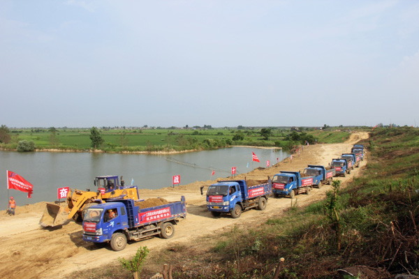 受前期連續強降雨及長江洪水倒灌、頂托影響,九江市河湖水位長時間處于超警戒水位狀態,導致該地區防汛形勢十分嚴峻,圩堤險情隨時可能發生,特別是堤腳處有池塘的圩堤更易出現險情。為確保廬山市沙湖山圩堤長期穩固,我司在接到該市防汛指揮部的除險加固任務后,立即派遣抗洪搶險突擊隊前往現場進行搶險,以穩固圩堤,確保圩堤內村莊百姓及農田安全。經過現場勘查,突擊隊決定沿著圩堤腳有池塘的地段填出一條長約1公里、寬20米的壓浸平臺進行加固處理。搶險方案確定后,公司迅速組織了3臺挖掘機、2臺裝載機、36臺自卸汽車等機械設備及40多名作業人員頂著炎炎烈日進行施工,力求在10天內完成搶險任務,確保圩堤安全。